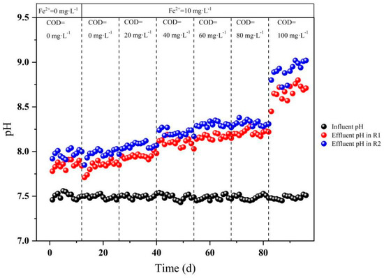 The pH variations in the two-stage anammox reactors under Fe2+ coupled with different concentrations of organic substrates are illustrated in Figure 7. Throughout the experimental period, the influent pH remained consistently stable at approximately 7.50. Under the condition of 10 mg/L Fe2+ addition, a gradual increase in effluent pH was observed as the influent COD concentration increased. When Fe2+ was coupled with 80 mg/L COD, the average effluent pH values in R1 and R2 reached 8.21 and 8.32, respectively. Compared to the condition involving the addition of organic substrates alone (as discussed in Section 3.1.2), the pH increase in both reactors occurred at a noticeably slower rate. This difference was likely attributable to the presence of Fe2+, which may have facilitated acid-producing reactions such as nitrogen-dependent ferrous oxidation (NDFO), thereby buffering the pH rise induced by increasing COD levels and enhancing the reactors’ tolerance to organic carbon loading. During days 82–96, when the system operated under 10 mg/L Fe2+ coupled with 100 mg/L COD, a sharp rise in effluent pH was observed, with the pH values in both R1 and R2 exceeding the optimal range for AnAOB activity.
