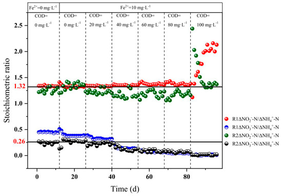 The changes in nitrogen stoichiometric ratios in the two-stage anammox reactors under Fe2+ coupled with varying concentrations of organic substrates are shown in Figure 8. During days 1–82, the ΔNO2−-N/ΔNH4+-N ratio in R1 remained around 1.32, while the ratio in R2 was slightly below 1.32, indicating that Fe2+ coupled with COD concentrations up to 80 mg/L had no significant inhibitory effect on the anammox process in either reactor. However, when Fe2+ was combined with 100 mg/L COD, both R1 and R2 exhibited substantial fluctuations in ΔNO2−-N/ΔNH4+-N ratios, which eventually stabilized at approximately 2.1 and 1.4, respectively—both notably higher than the theoretical value of 1.32. This deviation suggests that the high influent organic loading led to varying degrees of anammox inhibition in both reactors, with system performance rapidly deteriorating. As a result, excessive NO2−-N was consumed via the combined effects of Fe2+ and heterotrophic denitrifying bacteria. In addition, a continuous decline in ΔNO3−-N/ΔNH4+-N ratios was observed in both R1 and R2 with increasing COD concentrations, eventually approaching zero. This trend was consistent with the patterns observed under varying COD concentrations without Fe2+ addition.