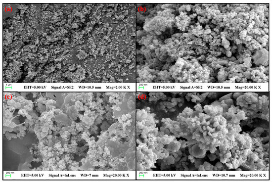 Figure 9 shows the SEM images of anammox biofilm samples taken from R1 and R2 on day 96 after treatment under the condition of Fe2+ coupled with an organic substrate (sodium acetate). Figure 9a and Figure 9b present SEM images of R1 biofilm at magnifications of 2k and 20k, respectively. The surface of the sludge appears irregular and relatively coarse; a magnified view of a representative region reveals a densely packed anammox microbial structure with a large number of spherical granular attachments. Figure 9c,d depict the SEM images of different regions of the R2 biofilm at 2k magnification. Similarly to R1, the R2 biofilm surface exhibits abundant protruding particles and porous features. This type of morphology may contribute to the enhanced tolerance of anammox bacteria to environmental fluctuations and their improved resistance to operational shocks. Moreover, the presence of pores is considered critical for sustaining microbial metabolism within the biofilm. Overall, the SEM analysis suggests that the structural morphology of the biofilm tends to stabilize under the combined influence of Fe2+ and sodium acetate, indicating that this coupling strategy supports the formation of a robust anammox biofilm structure.