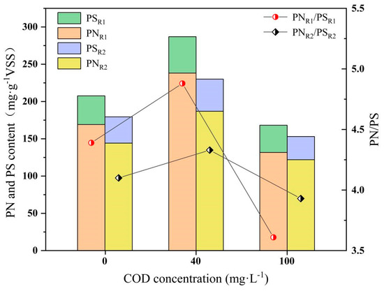 During the third experimental stage where 10 mg/L Fe2+ was coupled with 0, 40, and 100 mg/L COD, the contents of PN and PS in the anammox biofilm from R1 and R2 were analyzed on days 26, 54, and 96, respectively. The results are presented in Figure 10, which shows the variations in PN and PS concentrations in the sludge under different COD conditions with constant Fe2+ input. As observed, under the condition of 10 mg/L Fe2+ coupled with 40 mg/L COD, both reactors exhibited notable increases in PN, PS, and total EPS contents compared to the control group (Fe2+ only). In R1, the PN, PS, and EPS concentrations reached 238.17 mg/g, 48.76 mg/g, and 286.93 mg/g, representing increases of 41%, 26%, and 38.17%, respectively. In R2, the corresponding values were 186.94 mg/g, 43.15 mg/g, and 230.09 mg/g, with increases of 30%, 23%, and 28.25%, respectively. These findings suggest that the presence of organic carbon significantly stimulated microbial EPS secretion, and that the co-addition of Fe2+ and a moderate COD concentration could enhance anammox activity while promoting EPS production. Increasing COD concentrations initially led to the elevated production of EPS, while excessively high COD levels resulted in a decline in EPS content [25]. However, under the condition of 10 mg/L Fe2+ coupled with 100 mg/L COD, PN and PS concentrations in both R1 and R2 decreased markedly. This may be due to the inhibitory effect of excessive organic carbon on anammox activity, which leads to a reduction in EPS and its components, potentially resulting in system destabilization or even collapse [26]. Furthermore, under constant Fe2+ dosing, the PN/PS ratio in both reactors showed a rise-and-fall trend as COD increased from 0 to 40 and then to 100 mg/L. In R1, the variation in PN/PS was more pronounced, whereas in R2, the decline was less significant, indicating that R2 was less affected by organic shock and maintained a more stable nitrogen removal performance.