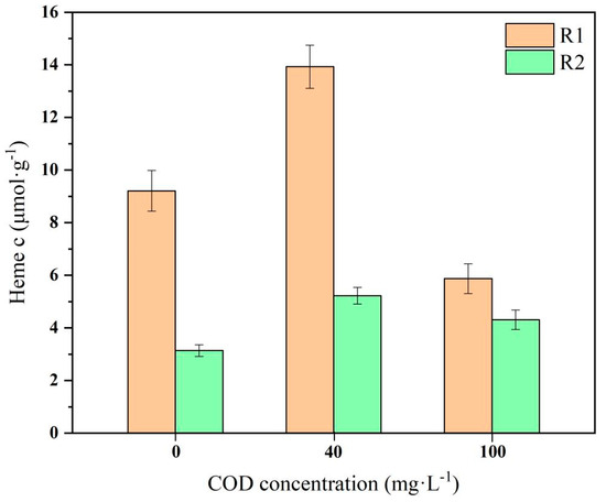 Figure 11 presents the variation in cytochrome c content in the two-stage anammox reactors under the condition of 10 mg/L Fe2+ coupled with 0, 40, and 100 mg/L COD. As shown in the figure, when 10 mg/L Fe2+ was coupled with 40 mg/L COD, the cytochrome c content in the sludge of R1 and R2 reached 13.93 ± 0.82 μmol/g and 5.22 ± 0.32 μmol/g, respectively, representing increases of 51.25% and 66.24% compared to the condition with Fe2+ addition alone. In contrast, under the condition of 10 mg/L Fe2+ coupled with 100 mg/L COD, the cytochrome c content in R1 sharply declined to 5.87 ± 0.57 μmol/g, whereas R2 exhibited a relatively smaller decrease. These results indicate that the co-addition of Fe2+ and a moderate concentration of COD significantly enhanced the cytochrome c content in anammox biofilm, likely promoting AnAOB activity. However, excessive COD loading exerted an inhibitory effect on AnAOB, leading to a substantial reduction in cytochrome c levels. Currently, limited studies have focused on the impact of organic substrates or Fe2+-coupled organics on cytochrome c production in anammox systems. Previous research has suggested that certain AnAOB are capable of utilizing organic compounds as auxiliary energy sources [27]. Thus, the moderate presence of organics may enhance the activity of key enzymes and facilitate AnAOB metabolism, potentially stimulating cytochrome c biosynthesis. It is hypothesized that organic substrates might serve as nutrients that are directly assimilated by AnAOB to promote cytochrome c formation. However, under high COD concentrations, the increased activity of heterotrophic denitrifiers may have outcompeted AnAOB, resulting in suppressed anammox activity and decreased cytochrome c synthesis.