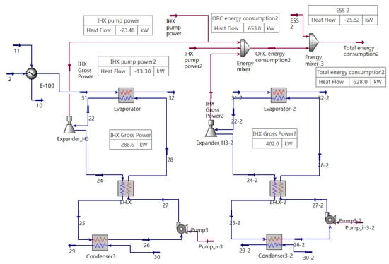 Based on these parameters, the simulation indicated power generation of 288.6 kW from ORC Generator No. 1 (utilizing exhaust gas waste heat) and 353.6 kW from ORC Generator No. 2 (utilizing engine-cooling water and other waste heat sources), resulting in a gross power output of 642.2 kW. After accounting for pump power and internal consumption, the final net output was 584 kW.