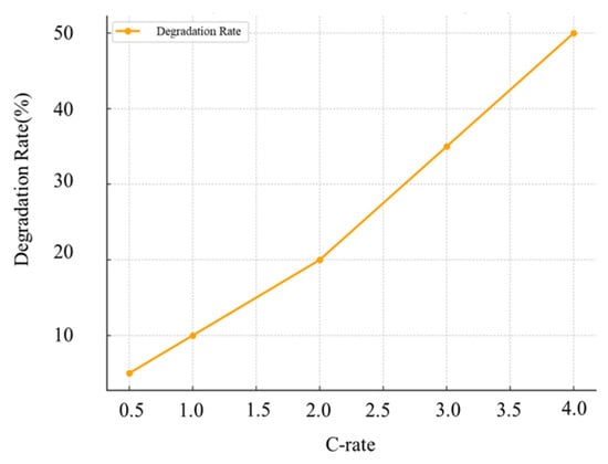 20]. Operation at a low rate, like 0.5 C, may result in degradation of around 5% over a certain period, whereas that at a high rate of 4.0 C can increase degradation to nearly 50%. The sharp increase observed beyond 2.0 C is primarily attributed to increased internal resistance and heat generation. Therefore, careful C-rate management is crucial in the design and operation of marine battery systems.