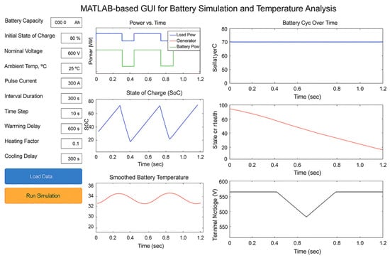 Figure 14) to facilitate user-friendly input of essential battery characteristics, including capacity, voltage range, internal resistance, and initial SoC. The program provides visual outputs for major indicators, such as SoC, state of health, temperature, voltage behavior, and degradation trends, thereby improving the intuitiveness and accessibility of battery behavior analysis for users.
