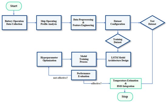 The proposed LSTM-based sensorless temperature estimation method followed a structured process: data preparation, model development, performance evaluation, and system integration. Initially, relevant battery operational data and corresponding ship navigation profiles were analyzed to generate appropriate training and testing datasets. These datasets then underwent normalization and feature engineering to transform the raw data into a format suitable for effective model training.