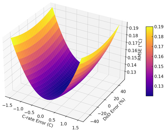 In this study, C-rate and depth of discharge (DoD) were incorporated as input features into the battery temperature prediction model to enhance its estimation performance. To quantitatively evaluate the impact of input accuracy on prediction precision, a three-dimensional surface plot was constructed to illustrate the variation in root mean square error (RMSE) as a function of C-rate and DoD error.