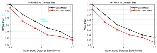 0). Two performance metrics, RMSE and mean squared error (MSE), were used for this evaluation. As expected, with the increased dataset size, both models exhibited improved performance, indicated by the decreasing error values. However, the proposed model consistently achieved lower RMSE and MSE across all tested dataset scales. This advantage was particularly noticeable under limited data conditions (e.g., N/N