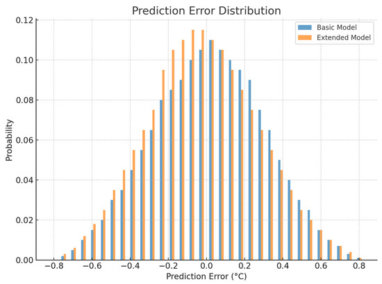 By contrast, the extended model exhibited a more concentrated error distribution centered closely around the center with lower variance. This indicates more consistent and stable estimation performance. The higher probability density within a narrow error range for the extended model suggests that incorporating C-rate and DoD as additional inputs allowed for a more accurate representation and estimation of battery-temperature variations across the test data.