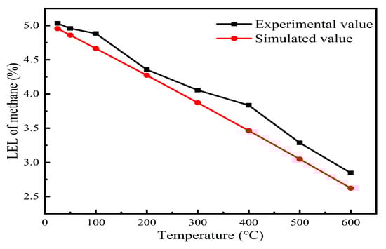 Experimental validation of the lower explosion limits (LELs) for methane–air mixtures was conducted at initial temperatures ranging from 25 °C to 600 °C; detailed data are presented in Table 1. The measured LEL values under the tested temperatures (25 °C, 50 °C, 100 °C, 200 °C, 300 °C, 400 °C, 500 °C, and 600 °C) were 5.03%, 4.95%, 4.88%, 4.35%, 4.05%, 3.53%, 3.28%, and 2.84%, respectively. The simulated and experimental results both exhibited identical trends, with deviations less than 5%, confirming that the LELs of methane–air mixtures decreased progressively with increasing temperature. Specifically, as the initial temperature rose from 25 °C to 600 °C, the LELs of the methane–air mixtures declined from 5.03% to 2.84%, demonstrating that elevated temperatures significantly increase the explosion risk of methane–air mixtures (Figure 2).