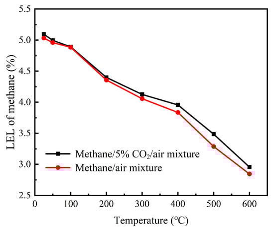 The experiment verified the lower explosion limits (LELs) of CH4/5% CO2–air mixtures at initial temperatures ranging from 25 °C to 600 °C, and compared them with the LELs of methane–air mixtures. The results are shown in Figure 3. At temperatures of 25 °C, 50 °C, 100 °C, 200 °C, 300 °C, 400 °C, 500 °C, and 600 °C, the LELs of methane–5% CO2–air mixtures were found to be 5.09%, 4.99%, 4.89%, 4.39%, 4.12%, 3.95%, 3.48%, and 2.95%, respectively. As the temperature increased from 25 °C to 600 °C, the LEL of the CH4–5% CO2–air mixture decreased from 5.09% to 2.95%. Notably, under the same temperature conditions, the LEL of the methane/5% CO2/air mixture was higher than that of the methane–air mixture. This result indicates that CO2 can suppress the explosion of methane.