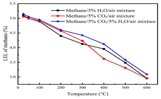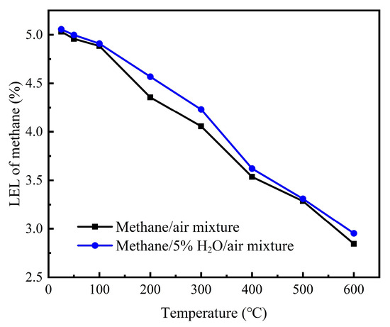 The experiment measured the lower explosion limits (LELs) of methane–5% H2O–air mixtures at temperatures ranging from 25 °C to 600 °C and compared these with the LELs of methane–air mixtures. The results are shown in Figure 4. At temperatures of 25 °C, 50 °C, 100 °C, 200 °C, 300 °C, 400 °C, 500 °C, and 600 °C, the LELs of methane–5% H2O–air mixtures were found to be 5.05%, 4.99%, 4.90%, 4.56%, 4.23%, 3.62%, 3.31%, and 2.95%, respectively. As the temperature increased from 25 °C to 600 °C, the LEL of the methane–5% H2O–air mixture decreased from 5.05% to 2.95%. Under the same initial temperature conditions, the LEL of the methane/5% H2O/air mixture was higher than that of the methane–air mixture, indicating that H2O can suppress methane explosions.