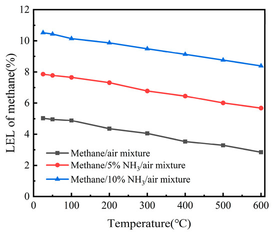 To investigate the effect of ammonia concentration on the lower explosion limits (LELs) of gas mixtures, Figure 5 shows the LELs of methane–air and methane–10% NH3–air mixtures at different temperatures. The experiments at 25, 50, 100, 200, 300, 400, 500, and 600 °C yielded the following LEL values for the methane–10% NH3–air mixture: 10.52%, 10.43%, 10.14%, 9.87%, 9.49%, 9.13%, 8.76%, and 8.39%, respectively. As the initial temperature increased from 25 °C to 600 °C, the LEL of the methane–10% NH3–air mixture decreased from 10.52% to 8.39%.