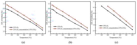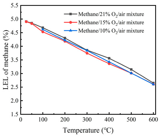 Experiments were conducted to determine the lower explosion limits (LELs) of methane–air mixtures at O2 concentrations of 21%, 15%, and 10% over a temperature range of 25–600 °C. The results are shown in Figure 6. The findings indicate that, at the same initial temperature, the O2 concentration had little effect on the LEL of the methane–air mixture.
