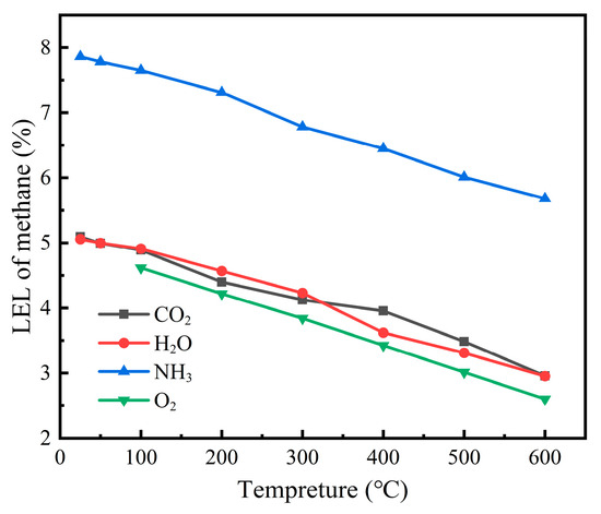As can be seen from Figure 8, NH3 demonstrated the most pronounced inhibitory effect on methane explosibility, maintaining substantially elevated LEL values (approximately 7.8–5.7%) throughout the entire temperature range. This marked increase in LEL suggests that NH3 functions as a highly effective chemical inhibitor, probably through radical scavenging mechanisms that interrupt chain-branching reactions critical to flame propagation. CO2 and H2O exhibited moderate inhibition characteristics with similar performance profiles. Both additives maintained the LEL around 5% at ambient temperature, gradually decreasing to approximately 3% at 600 °C. Their inhibitory action can primarily be attributed to thermal dilution effects, where their relatively high heat capacities absorb combustion energy and reduce flame temperature. O2 addition produced the lowest LEL values across all temperatures, confirming its role as a combustion promoter rather than an inhibitor. This behavior aligns with fundamental combustion principles, as increased oxygen availability enhances oxidation reaction rates and broadens flammability limits. Universal temperature dependence was evident across all additive types, with LEL values consistently decreasing as temperature increased. This relationship underscores the heightened explosion risk in elevated temperature environments, where progressively lower methane concentrations become sufficient to form explosive mixtures. The varying slopes of these curves provide additional insights. NH3 exhibited a relatively moderate gradient, indicating that its inhibitory efficiency remained relatively stable across the temperature spectrum. In contrast, the steeper gradient observed with O2 suggests a more pronounced temperature sensitivity.