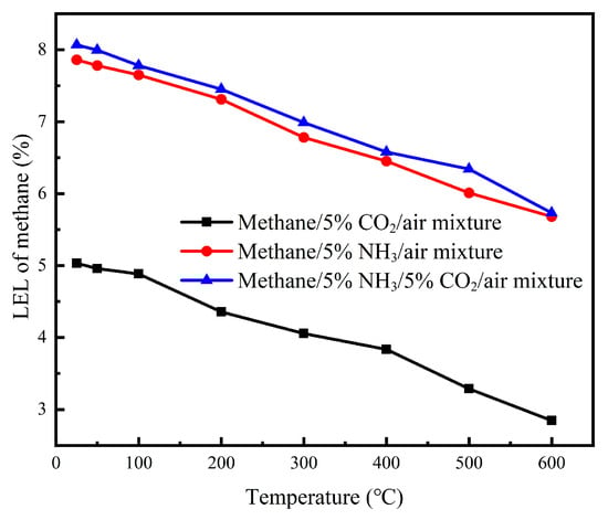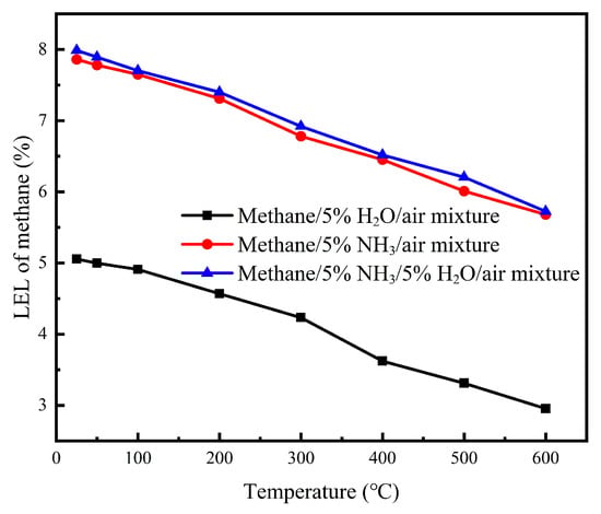 It is noteworthy that under the same temperature conditions, the LEL of the methane–10% NH3–air mixture was significantly higher than that of the methane–5% NH3–air mixture. The results indicate that the LEL of the methane–ammonia–air mixture increased with the concentration of ammonia. As the ammonia concentration increased, the effect of suppressing the explosion of the mixture became more pronounced.