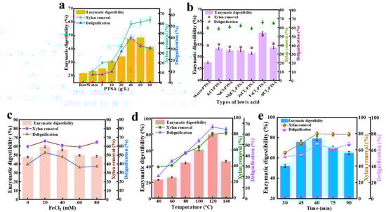 Investigating PTSA’s (5–80 g/L) influence on enzymatic digestibility, xylan elimination and lignin removal [100 °C, 60 min, solid–liquid ratio 1:10] (a). Examining Lewis acids’ (KCl, NaCl, MgCl2, ZnCl2, AlCl3, FeCl3) influence on enzymatic digestibility, xylan elimination and lignin removal [100 °C, 60 min, solid–liquid ratio = 1:10, 40 g/L PTSA, 20 mM Lewis acid] (b). Evaluation of FeCl3 loading (0–80 mM) in influencing enzymatic digestibility, xylan elimination and lignin removal [100 °C, 60 min, solid–liquid ratio 1:10, 40 g/L PTSA] (c). Assessment of pretreatment temperatures (40–140 °C) in influencing enzymatic digestibility, xylan elimination and lignin removal [60 min, solid–liquid ratio 1:10, 40 g/L PTSA, 20 mM FeCl3] (d). Investigation of pretreatment duration (30–90 min) in influencing enzymatic digestibility, xylan elimination and lignin removal [120 °C, 40 g/L PTSA, 20 mM FeCl3, solid–liquid ratio 1:10] (e).