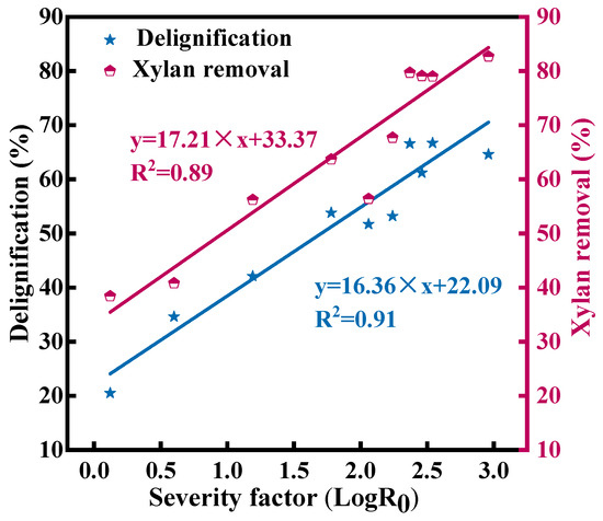 LogR0 is an important index for evaluating pretreatment intensity [32]. During the optimization process, there were certain fittings about LogR0–delignification (R2 = 0.91) and LogR0–xylan elimination (R2 = 0.89) (Figure 2). Chen et al. also reported a correlation between LogR0 and xylan elimination (R2 = 0.90) and between LogR0 and delignification (R2 = 0.85) [13]. These results showed that high LogR0 was beneficial to the preferential dissolution and elimination of lignin and xylan during pretreatment, which effectively promoted the destruction of the natural physical barrier structure of WS. These alterations will contribute to the subsequent biotransformation of cellulase [34].