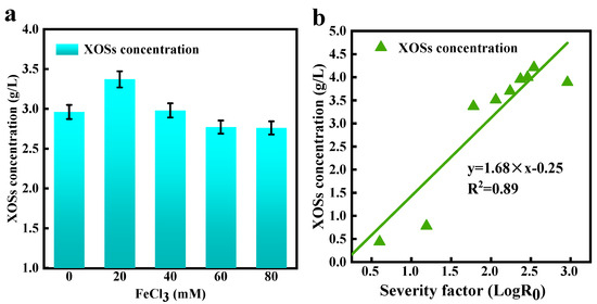 Assessing FeCl3 loading (0–80 mM) in influencing the generation of XOSs [60 min, 100 °C] (a); correlation between LogR0 and XOS content (b).