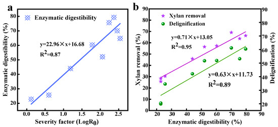 The fitting about LogR0 and enzymolysis ability (a); the fitting about delignification and xylan elimination with enzymolysis ability (b).