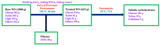 The pretreatment and enzymolysis processes of WS are illustrated in Figure 5; 1000 g of crude WS containing 382 g glucan, 202 g xylan, 154 g lignin, and 262 g of other substances was put into the pretreatment reactor. After the crude WS was treated at 120 °C for 60 min (solid–liquid ratio 1:10), 615 g WS residue was recovered, and the treated WS was composed of 324 g glucan, 41 g xylan, 51 g lignin, and 199 g of other materials. In the pretreatment liquor, 40 g XOSs formed. The remaining glucan in treated WS was enzymatically hydrolyzed with cellulases (15 FPU/g), while the xylan was also attacked to release part of xylose, yielding 281 g glucose, 35 g xylose, and 5 g cellobiose.