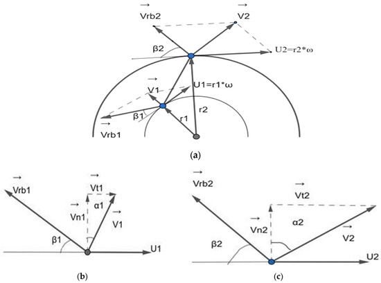 Behavior of the fluid velocity vectors at the entry and exit of the blade, when the fluid passes through the channel between blades [5]. (a): Absolute speed as the sum of the speed relative to the blade and the speed of the rotor; (b): speed polygon at the entrance of the blade; (c) speed polygon at the blade exit.