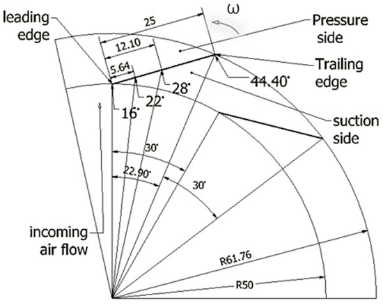 The values of the incidence angle used were 16, 22, and 28 degrees and were measured using an adjustable goniometer with a precision of 0.1°. These values were selected via analysis of the relative angles of the fluid movement at the end of the inter-blade channel, where the wear is greater in fans.