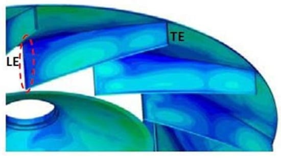 According to the work of Cardillo et al. [14], the greatest erosion occurs in the blade entry zone, as shown in Figure 3, coinciding with the separation zone of the boundary layer and the appearance of eddies. This behavior is in correspondence with previous experimental results [10].