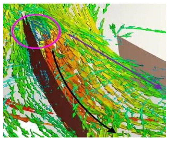In Figure 4, the velocity behavior in the fluid is shown, and the turbulence and recirculation of the flow at the leading edge of the blade can be clearly seen (area inside the circle) [17].