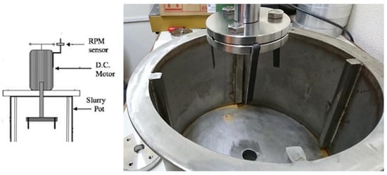 Analyzing these factors, it was determined to use a sludge erosion test installation, as shown in Figure 5. This installation allows the erosive medium to be dosed in water to obtain a desired aggressive medium and thereby shorten the test times without differing from the basic action of particles in low-pressure fans. The erosion installation also allows us to simulate the behavior of the fan using blade-shaped samples. With this arrangement, the samples would act in a similar way to the fan blades but without the confinement created by the inter-blade channel. Figure S2 shows the guide for the actions of this methodology used in the experimentation, and Figure 5 shows the layout and shape of the installation.