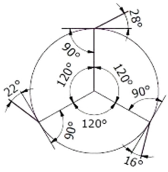 Typically, the angle of the blade in this area with respect to the tangent to the entrance circle is 16°, but the path of the fluid with respect to the surface of the blade is affected by the meridional and tangential components of the velocity [18], so, in reality, this angle varies depending on the operation of the fan.