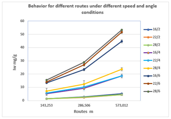 In the graph of Figure 7, with an increasing test speed, the magnitude of wear increases for the same distance traveled. It is also notable that the differences in behavior that occurs when increasing the angle are very small for the speed of 2 m/s but increase progressively with the increase in speed, the differences being marked for the speed of 6 m/s. This behavior can be determined when selecting the fan design parameters.