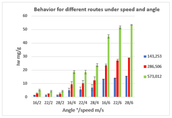 - There are differences in the behavior of the increase in wear that occur when the angle of incidence increases; they are very small for the speed of 2 m/s, but they increase progressively with the increase in speed, the differences mostly being marked for the speed of 6 m/s.