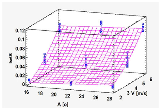 The wear rate (Iw) per distance traveled (Iw/s) was taken as the dependent variable. Speed and angle, their powers, and their interactions were included in the model as independent variables to explore the potential combination of factors. After eliminating non-significant variables, the final expression of the model is shown below: