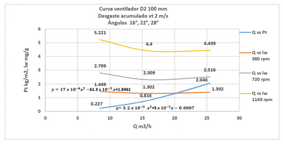 Figure 10 shows the characteristic curve of the fan, flow (Q) vs. total pressure (Pt), for the revolutions of 380, 720, 1140, and the accumulated wear curves (lw) considering the same for the revolution configuration of the shaft installation transmission