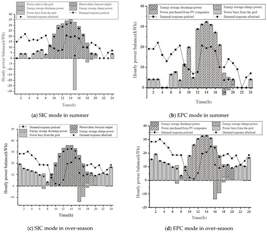 Figure 3a,b show that the highest PV output occurs between 9:00 to 17:00, with time-shiftable loads primarily concentrated in this period following demand response. The energy storage system is charged from 17:00 to 19:00 and discharged from 19:00 to 20:00. In the SIC mode, the PV output is generated on-site, and power is sold between 14:00 and 15:00. In the EPC mode, the PV output must be purchased from the PV enterprise. Due to identical tariffs during certain hours, multiple optimal solutions are available for demand response.