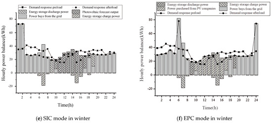 Figure 3c,d indicate that in the SIC mode, there is no sale of electricity to the external grid for the entire period, suggesting that the PV output is insufficient to meet electricity demand. The charging and discharging strategies in both modes are generally similar, with load transfers executed according to the time-of-use tariff. Consequently, the load after partial transfer is significantly higher than it was before the transfer. The optimization results for both modes during the over-seasonal period are largely comparable, with multiple optimal solutions for demand response due to identical tariffs during certain periods.