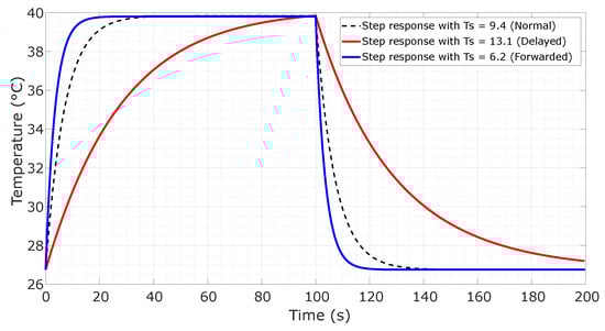 Using the model parameters presented in Table 1 for the nonlinear system and its nonlinear representation, the approximate system time constant value becomes s, and the dead time value becomes about s, as shown in Figure 2. The system’s response in terms of dynamics when the time constant is forward or delayed with respect to that of the real system is represented below in red and blue lines, respectively. Such forward and delayed system dynamics are actually modified based on the model’s aforementioned parameters, and the simplified version of the linear system with a changed time constant is given by Equations (3) and (4). Note that the CFOTD model, as presented in both Equations (3) and (4), is equivalent. However, both forms are provided here to facilitate the design and test of the NMPC-based AC controller, respectively. This dual representation is beneficial for assessing and optimizing the control strategies within the context of a model that captures both the thermal dynamics and time delays inherent in the system. This is achieved by varying the estimated linear time parameters; the obtained response is used to find a similar output from the nonlinear model, adjusting parameters usually affected by the environment such as heater factor, heat capacity, and power correction factor. New time-based internal disturbed plants will be modeled and evaluated in later sections. In order to leverage this approach, we ensured a comprehensive evaluation of the proposed control techniques, particularly in terms of handling the complexities of nonlinear behavior and time-varying dynamics.