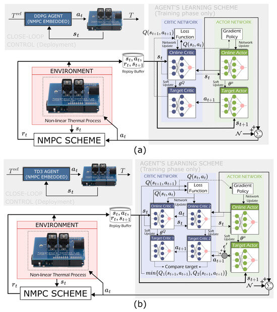 This section describes the development of the AC framework used for training agents, which forms the foundation of the proposed robust control strategy. In this architecture, the actor is responsible for selecting control actions, while the critic evaluates those actions by estimating a value function, thus guiding control policy improvement over time. With the aim of achieving a proper mathematical statement [24], an agent systematically collects data from temperature sensors representing the thermal state , applies actions corresponding to the heater control input, and records the resultant thermal responses [42]. The learning process involves iteratively refining the control policy by updating internal controller parameters based on feedback obtained from previous interactions with the environment. These updates are guided by a reward signal that incorporates both performance objectives and penalties, thus enabling the agent to converge toward an optimal policy that maximizes the expected cumulative reward . To execute control, the agent selects actions based on the policy , being informed by the reward function that guides the agent towards learned control actions. In the thermal system of our study, the system dynamics are assumed to adhere to the Markov decision process (MDP) [43], which asserts that the future rewards and states are conditionally independent of past states, given the present state and action . The AC framework incorporates DRL techniques, specifically (i) the deep deterministic policy gradient (DDPG) and (ii) the twin delayed deep deterministic policy gradient (TD3), as depicted in Figure 3. These agents are then integrated with NMPC, resulting in the design of a robust control strategy tailored to the control of thermal process with long time delays. By combining the advantages of AC methods and NMPC, our approach leverages the strengths of both model-based optimization and data-driven learning, enabling adaptability while tracking temperature references and further enhancing robustness while counteracting disturbances.