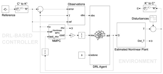 Simulink block diagram of the proposed DRL–NMPC hybrid control framework for temperature control in nonlinear thermal processes with long time delays.