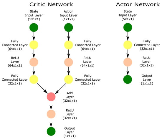 The DDPG algorithm uses an AC architecture [44] to train the agent efficiently. This framework consists of two primary neural networks: (a) the actor, which generates control actions based on state observations, and (b) the critic, which evaluates these actions and refines its value function estimates accordingly. To mitigate instability in learning and reduce the risk of divergence caused by abrupt value function updates, two auxiliary networks are introduced: (i) a target actor network and (ii) a target critic network. These target networks undergo periodic updates, ensuring that the learned policy remains stable and aligns with the main network’s value estimations. By maintaining temporarily fixed parameters in the target networks, the algorithm effectively minimizes oscillations arising from discrepancies between learned and estimated values, encouraging smoother convergence.