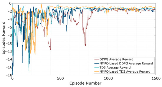 However, the NMPC effectiveness was significantly reduced when addressing disturbances such as dead time and time delays, which can introduce unpredictability into the system’s behavior. This reduction in performance highlights the sensitivity of NMPC to system disturbances, which can compromise its reliability under such conditions. Despite a marginal increase in control effort from the proposed control techniques (DDPG, TD3, NMPC-based DDPG, and NMPC-based TD3) with respect to PID and NMPC, the control performance in terms of trajectory tracking was demonstrated to be favorable when using AC-based control methods in the presence of time delays and dead time disturbances.