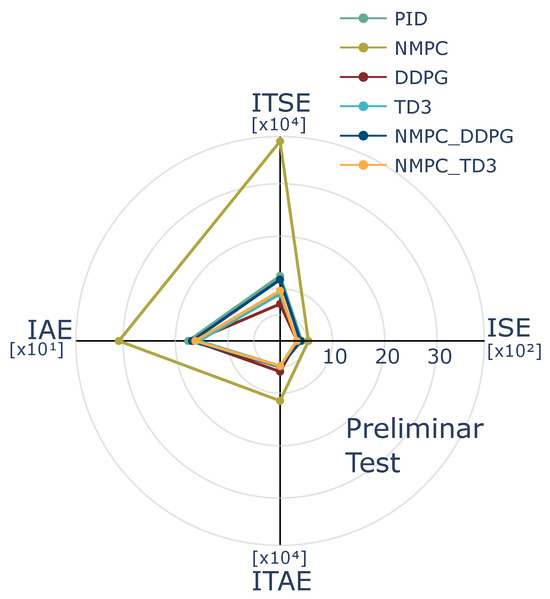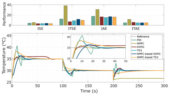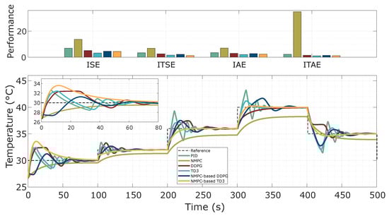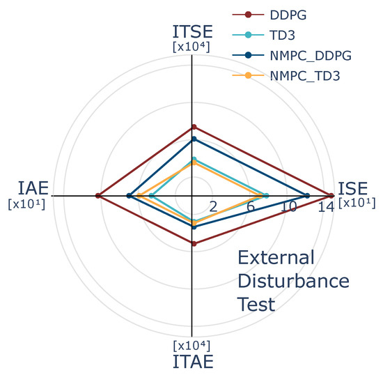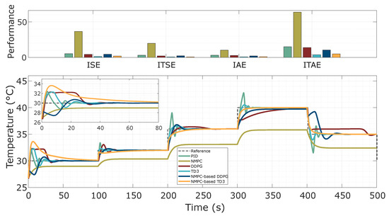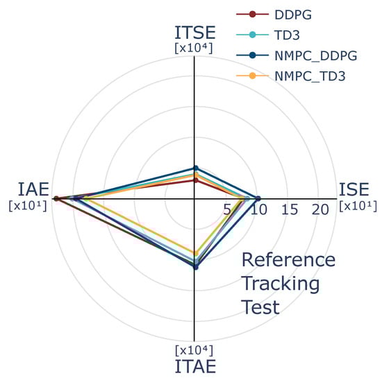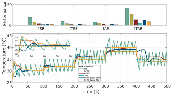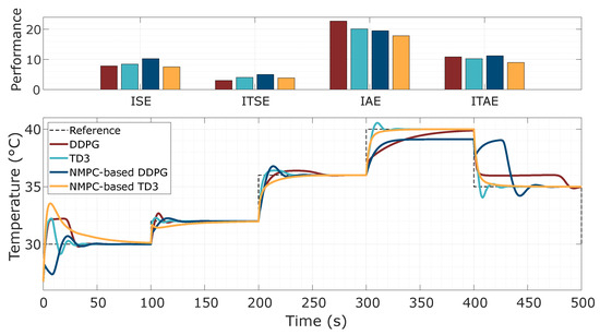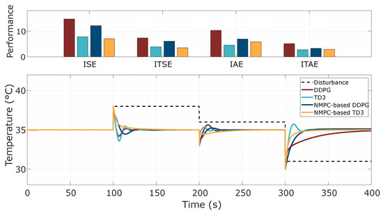 The quantitative analysis of control performance presented in Table 8 demonstrated that the NMPC-based TD3 controller outperformed its counterparts across several metrics, achieving an IAE of 58.8, which is significantly lower than that obtained with DDPG (i.e., IAE = 103.2) and the one attained with NMPC-based DDPG (i.e., IAE = 69.8). Such a IAE improvement indicated the effectiveness of reducing steady-state errors in the regulation of the thermal system dynamics. The TD3 approach and NMPC-based TD3 yielded lower ISE values compared to DDPG and NMPC-based DDPG. This indicates that TD3 controllers generally produce a smaller cumulative error, suggesting that TD3 approaches are more resilient to error accumulation due to external disturbances. In addition, the NMPC-based TD3 approach presented an ITAE of 2.94 , which is lower than that obtained with DDPG (i.e., 5.152 ) and NMPC-based DDPG (i.e., 3.34 ), strengthening the robust control performance. Although the TD3 approach exhibited comparable performance to NMPC-based TD3 in terms of ISE and ITSE, the NMPC-based TD3 excelled across a broader range of the test metrics, encompassing IAE and ITAE. This highlights the achieved control robustness and the effectiveness of the NMPC-based TD3 approach in comparison to the standard TD3. Analogous robust performance outcomes were achieved with TD3 and DDPG, since their learning model architectures follow related characteristics, but all metrics from the models based on TD3 consistently outperformed all those based on DDPG. In general, when comparing agents with the same AC architecture but different control policy approaches, NMPC-based agents demonstrated enhanced performance metrics, indicating that the NMPC strategy also contributed to the robustness of the control system against disturbances and long time delays. Figure 12 presents the integration results of NMPC with TD3, showing lower values in ISE, ITSE, and ITAE compared to the standalone DDPG and TD3 controllers. This performance outcome highlights the effectiveness of combining NMPC with DRL strategies. In particular, the integration leverages NMPC’s capability to track the reference trajectory against thermal disturbance, while TD3 contributes improved stability and sample efficiency through its twin critic structure. This hybrid approach resulted in robust control performance, the best disturbance rejection, and reduced tracking errors over time, making it suitable for the delayed dynamics of thermal systems.