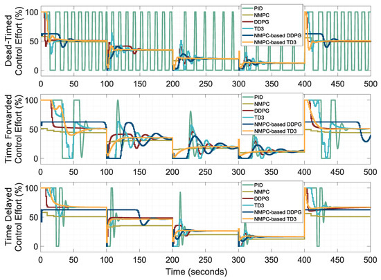 According to Table 9, the AC-based controllers consistently exhibited low tracking errors despite substantial variations in the system’s dead time. This consistent performance can be attributed to the inherent capacity of actor–critic (AC) agents to learn adaptive control policies from a broad range of dead time changes, allowing them to generalize effectively to previously unseen disturbances and temporal misalignment between control input and system response. Such generalization capability is particularly advantageous in the thermal system of the TCLab module, where the transistor’s nonlinear heat transfer dynamics are highly sensitive to input delays and parameter variations. Notably, although DDPG and TD3-based strategies yielded higher ITAE values (i.e., 13.87 and 6.07 , respectively) than their NMPC-integrated counterparts, they still outperformed traditional controllers such as PID and NMPC under similar operating conditions. Furthermore, the NMPC-based TD3 approach achieved the lowest ITSE and ITAE values (i.e., 1.66 and 9.02 , respectively), indicating its enhanced ability to attenuate cumulative errors even in the presence of varying dead time. These results demonstrate the benefit of integrating NMPC with AC-based controllers, particularly while handling a nonlinear thermal system where the interaction between control inputs and heat propagation is delayed and nonlinear. While the NMPC component offers predictive capabilities for handling system constraints and model-based predictions, the DRL agents continuously refined the control policy based on observed performance, resulting in improved stability and tracking accuracy. Additionally, the NMPC-based DDPG controller demonstrated closeness to reference temperatures, with only marginal increases in the instantaneous and accumulated errors. This indicates that combining NMPC with AC-based methods can significantly enhance control robustness, particularly for thermal systems with time-varying dynamics and long time delay effects.