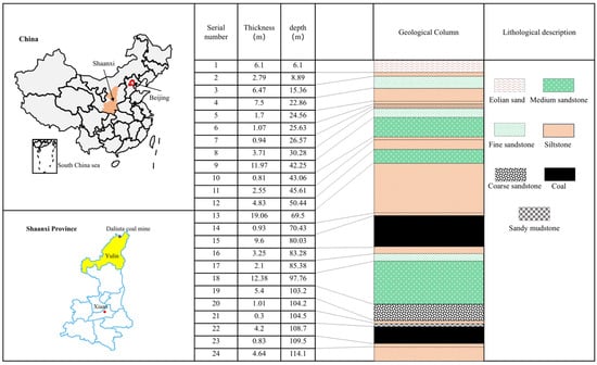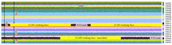The Huojitu mine, part of the Shendong-Daliuta coal mining area, is situated in Shenmu City, Shaanxi Province. The mine contains two coal seams: #12 and No. 22, with the latter being the current primary mining target. The #22 coal seam has an average burial depth of 120.28 m and a thickness of 4–5 m. Overlying this, the #12 coal seam exhibits an average burial depth of 99.73 m and a thickness of approximately 6 m. The inter-seam spacing between the #22 and #12 coal seams averages 30.64 m, and they can thus be classified as a close-distance coal seam group. As the #12 seam has been largely mined out, abundant residual coal pillars remain in the goaf areas. This configuration poses two critical engineering challenges: (1) optimizing roadway layout in the #22 seam and (2) preventing surface air leakage. This study focuses on the #22 coal seam’s 22,209 fully mechanized mining face. The burial depth of this working face ranges from 67.2 to 116.9 m (average: 70.43 m), with a coal seam thickness of 4.2 m and dip angles of 1–3°. The immediate roof and floor of the working face consist of siltstone. Above the face lie the mined-out areas of the #12 coal seam’s 12,201 and 12,203 working faces, with an inter-seam spacing of approximately 24.5 m. The stratigraphic column of the 22,209 working face is illustrated in Figure 1.