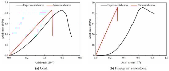 To accurately capture material mechanical behavior, mesoscopic parameters in the particle flow model were calibrated to match macroscopic rock properties. The calibration process followed Wang et al. [], focusing on two parameter categories: (1) particle properties: density, friction coefficient, Young’s modulus, and normal-to-shear stiffness ratio; (2) parallel bonds: Young’s modulus, normal-to-shear stiffness ratio, tensile strength, shear strength, and friction angle. Calibration was validated through agreement between simulated and experimental stress–strain curves and failure modes, ensuring DEM parameters effectively represented macroscopic coal-rock behavior. The calibrated mesoscopic parameters for each stratum are summarized in Table 1, Figure 3 shows the calibration results of coal and fine-grained sandstone.
