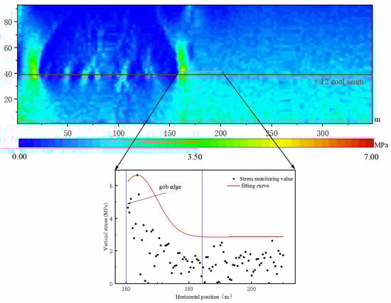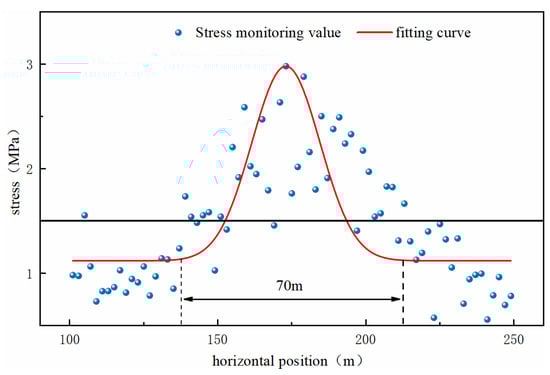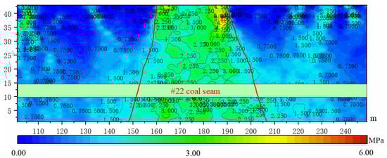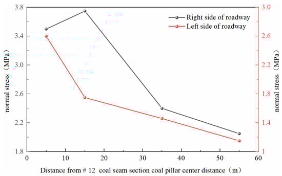 As shown in Figure 5, mining of the overlying #12 coal seam induced significant stress concentration in section coal pillars. This resulted in a trapezoidal stress distribution pattern in the underlying strata, where the spatial extent of stress concentration expanded with depth while its magnitude diminished. Stress distribution in the #22 coal seam beneath the #12 seam was monitored (Figure 6). The stress magnitude peaked directly below the pillar center, exhibiting a symmetrical decline toward both sides. At 35 m from the pillar center, stress levels fell below in situ values due to pressure relief from the overlying goaf.