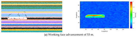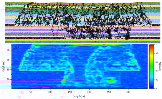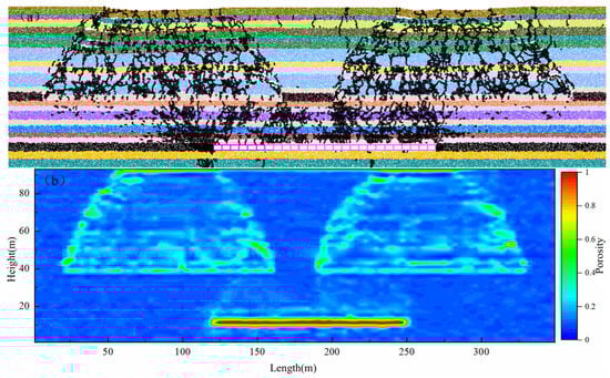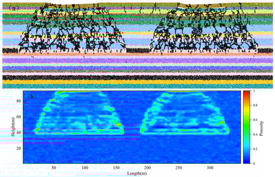 Figure 12a reveals that initial overburden fracture and collapse occurred at a panel advance of 52 m, with pronounced subsidence observed in Layers 19 to 17. The presence of backfill blocks substantially mitigated deformation severity. Comparative analysis with Figure 10a demonstrates significant reduction in interlayer bed separations and oblique fractures along goaf margins under backfilled conditions. Microscopic fractures propagated upward to Layers 16–14. At 70 m advancement, microfractures extended to the floor of Coal Seam #12, resulting in complete interlayer failure. Backfill blocks effectively restricted settlement height of fractured overburden. Vertical high-porosity pathways were constrained, with only multiple transverse interlayer channels developing (porosity ~0.2). Comparison of Figure 10b and Figure 12b indicates markedly reduced porosity in fractured overburden and non-interconnected leakage pathways between upper and lower goafs under backfilling. Porosity remained stable at ~0.2 during subsequent advances (87 m and 110 m), though spatial propagation occurred in both vertical and lateral directions. Oblique leakage pathways along abandoned upper goafs progressively interfaced with lower channels. Nevertheless, compared to unfilled conditions, both pathway development intensity and leakage magnitude were significantly reduced.