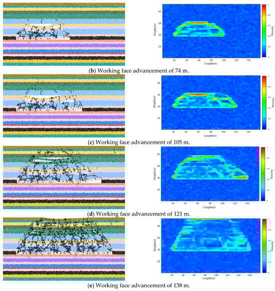 Figure 8: Simulated overburden collapse during mining of the #12 coal seam’s 201 working face. As shown in Figure 8a, when the 201 working face advanced to 56 m, the immediate roof (Layer 11) experienced initial collapse, triggering the first weighting event. Mining-induced fractures propagated upward, with collapsed zones exhibiting higher porosity. The main roof (Layer 10) remained largely unaffected, retaining lower porosity. At 74 m advancement, failure of the key stratum (Layer 10) induced the first periodic weighting of the main roof, with a weighting interval of 18 m. Collapsed zones adopted a trapezoidal geometry, accompanied by pronounced lateral fractures. Vertical fractures emerged in central goaf areas, extending upward to Layer 07, while high-porosity zones and bed separation cracks dominated goaf margins. During the third periodic weighting at 105 m, the key stratum (Layer 07) prevented fracture propagation to overlying strata (Layers 07–05). Cyclic collapse occurred between Layers 11 and 08, expanding horizontally rather than vertically. The fourth periodic collapse at 121 m caused vertical expansion of collapsed zones through Layers 07–05. Microscopic fractures proliferated in Layers 04–02, with porosity maps revealing interconnected vertical fractures along goaf margins, forming inclined fracture channels extending to the bed separation zone between Layers 05 and 04. At 138 m advancement, pronounced bending subsidence occurred in upper Layer 05. Minor bed separation between Layer 02 and surface Layer 01 connected preexisting inclined fracture channels, enabling fracture propagation to the surface. This suggests potential air leakage pathways from the #12 goaf to the surface, allowing atmospheric air ingress. Throughout the mining process, periodic weighting events recurred at intervals of 13–20 m.