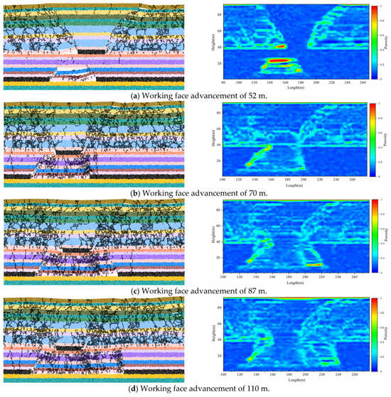 Mining of the #22 coal seam’s 209 working face commenced after completion of the overlying #12 seam. Based on optimal roadway layout analysis, the 209 working face roadway was positioned 45 m horizontally from the center of the upper section coal pillar. Figure 10 depicts the overburden collapse during mining of the 209 working face. At 52 m advancement, Layers 19–17 fractured and collapsed, while mining-induced cracks developed in Layers 16–13. High-porosity “oblique zones” formed along both sides of the goaf, yet porosity did not extend to Layer 16 or the interburden strata, indicating no interconnected air leakage pathways between seams at this stage. At 70 m advancement, the face traversed the overlying section coal pillar. Excessive interburden stress caused complete fracture of the interlayer strata. Vertical cracks propagated through the central and peripheral zones of the goaf, connecting to the abandoned #12 goaf. This established cross-seam air leakage pathways, allowing oxygen-depleted gas from the #12 goaf to flow downward into the 209 working face goaf. Porosity distribution maps confirmed that high-porosity zones extended to the #12 goaf. Notably, the high-porosity oblique zones on both sides of the section pillar became interconnected, enabling surface air leakage to penetrate both upper and lower goaf areas through this channel. Cumulative mining thickness increased overburden subsidence, inducing a “reactivation effect” on the abandoned upper goaf. Fractured strata in the upper goaf underwent secondary crack development, with microscopic fractures proliferating and overall porosity rising significantly. At 87 m and 110 m advancements, the interburden experienced its 2nd and 4th periodic fractures, respectively. The influence zone of lower-seam mining expanded progressively, with porosity increases spreading across the abandoned upper goaf. Simultaneously, strata above the section coal pillar fractured extensively, accompanied by marked porosity elevation.