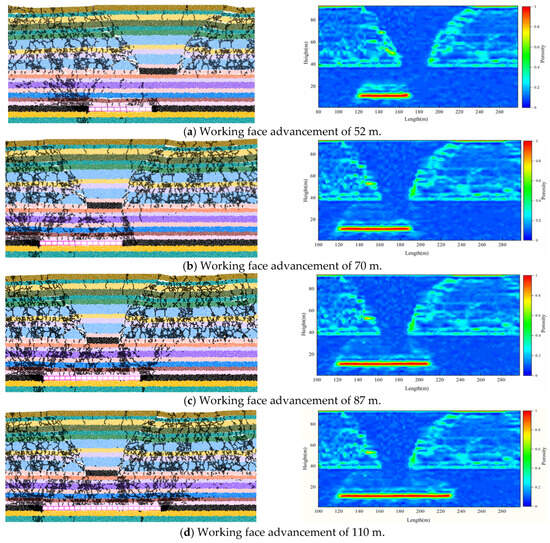 Figure 12 presents simulated overburden collapse patterns and fracture generation processes during backfill mining at Panel 22,209 of Huojitu Mine.